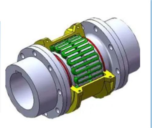 (2)撓性聯(lián)軸器:又分為齒套式和蛇形彈簧式兩種。齒套式聯(lián)軸器用套微的內(nèi)齒分別與兩個齒輪嚙合,使兩個轉(zhuǎn)子聯(lián)接起來。它的優(yōu)點是有一定的活動性,可以消除和減弱振動的傳遞,對轉(zhuǎn)子中心要求不很高,不傳遞軸位移,但必須在運轉(zhuǎn)時通入潤滑劑,檢修和安裝要求質(zhì)量高。蛇形彈簧管聯(lián)軸器是在兩個被連接的對輪的外緣銑出的類似漸開線的牙齒上,沿園周嵌入若干彈性剛帶制成的蛇形彈簧,把兩個對輪聯(lián)接起來。優(yōu)點是:能避免傳遞振動,又允許轉(zhuǎn)子有較大的中心偏差和軸向位移。但結(jié)構(gòu)復(fù)雜、傳遞力矩小,運行中需要潤滑。